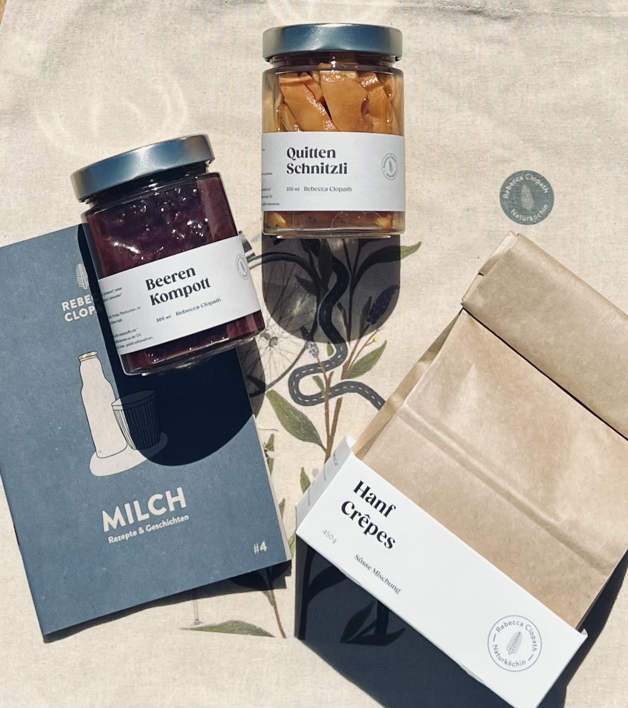 Hanf Crèpes, Quittenschnitze eingelegt, Rezeptbüchlein Milch, Beerenkompott, Clopath Beutel