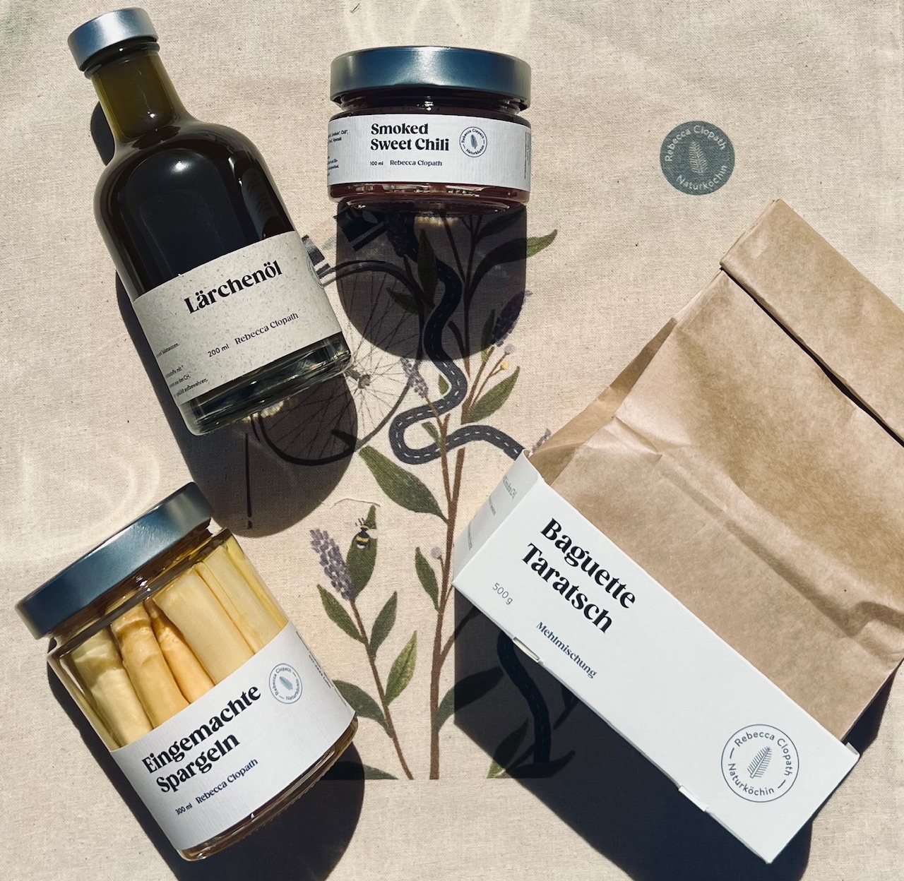 Baguette Taratsch, Spargel eingemacht, Smoked Sweet Chili, Lärchenöl, Clopath Beutel